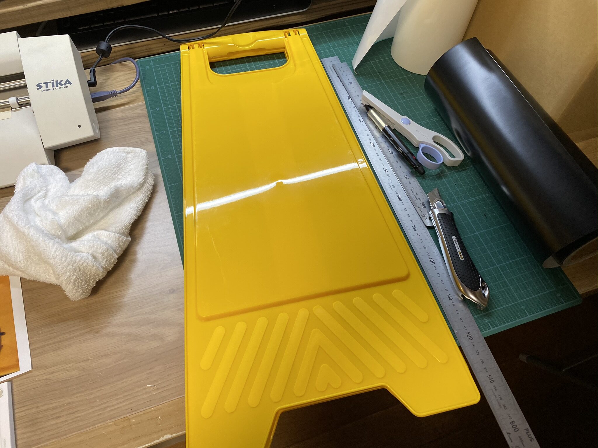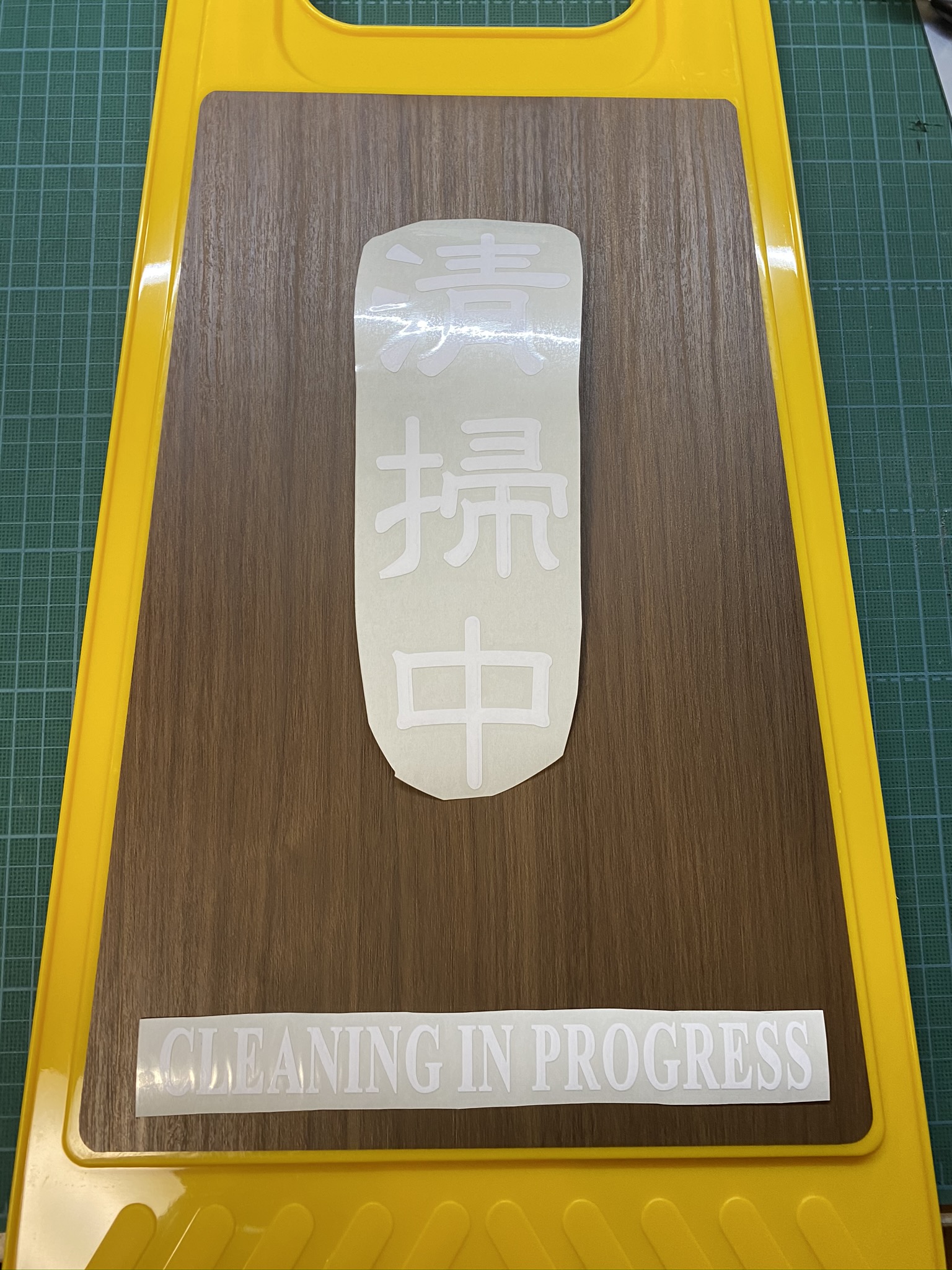 合うサイズに切りまして、立札の本体と木目調ステッカー、