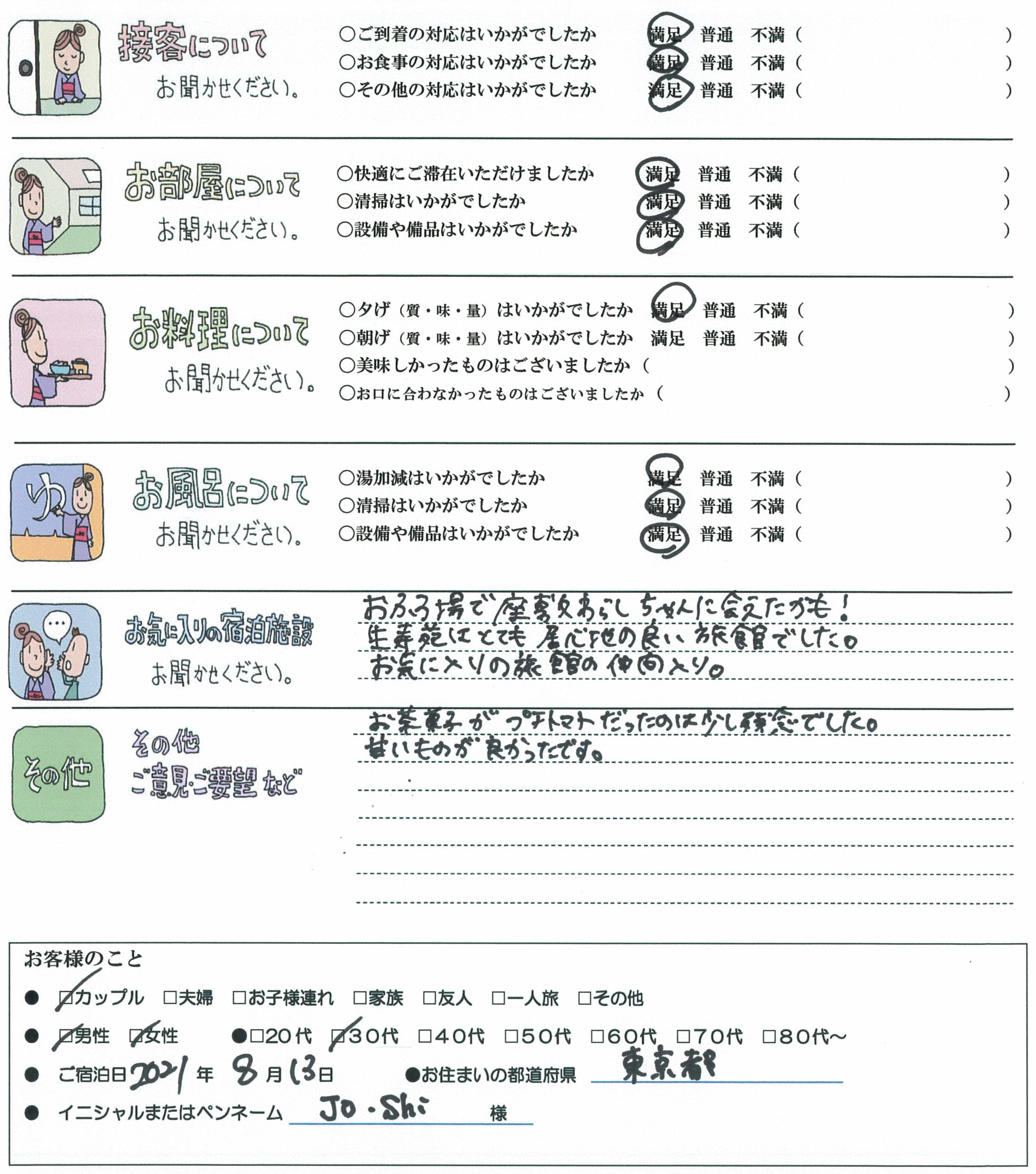 おふろ場で 座敷わらしちゃんに会えたかも! 生寿苑は とても居心地の良い旅館でした。 お気に入りの旅館の仲間入り。 お茶菓子が プチトマトだったのは少し残念でした。 甘いものが良かったです。 カップル/男性・女性/30代/2021年8月13日/東京都/Jo・Shi様