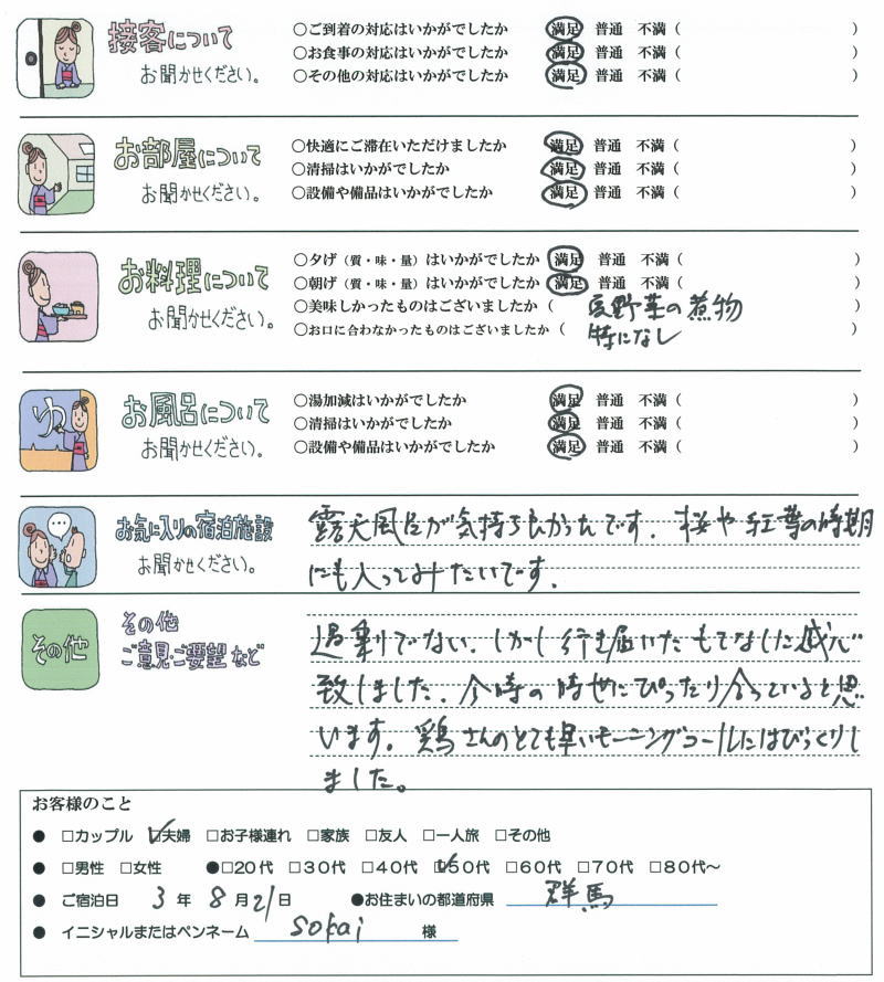 露天風呂が気持ち良かったです。 桜や効用に時期にも 入ってみたいです。 過剰ではない、しかし行き届いたもてなしに感心致しました。 今時の時世にぴったり合っていると思います。 鶏さんのとても早いモーニングコールには、 びっくりました。 夫婦/50代/2021年8月21日/群馬県/Sokai様